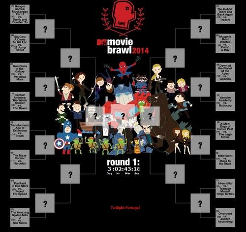 ''A primeira fase do MTV Movie Brawl 2014 já terminou! Pois bem, agora já temos o resultado do “peneirão”, onde seguem na disputa Tracers, de Taylor Lautner, The Rover e Maps To The Stars, de Robert Pattinson, Camp X-Ray e Sils Maria, de Kristen Stewart, The Hobbit: There and Back Again, de Lee Pace, Teenage Mutant Ninja Turtles, de Noel Fisher, e Interstellar, de Mackenzie Foy. As batalhas ocorrem de dois a dois até que se encontre um vencedor. Esta fase da votação, que acontece no site , termina já daqui a 3 dias. A proposta do MTV Movie Brawl eh eleger, de acordo com o público, o filme mais esperado do ano. Clique aqui e vote!''